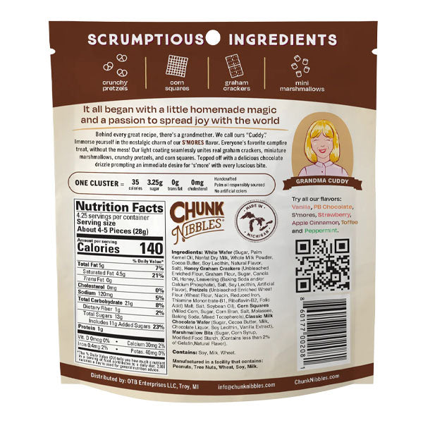 Behind every irresistible cluster is a grandmother named Cuddy. Her original blend of premium ingredients laid the foundation for what Chunk Nibbles is today: a family-owned business dedicated to quality, tradition, and small-batch craftsmanship. Every cluster is thoughtfully made to feel homemade, indulgent, and just a little bit special.