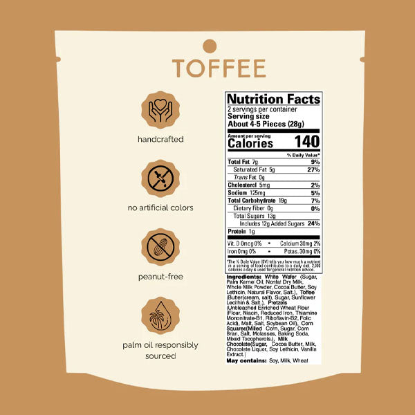 | Toffee Flavor Ingredients | White Wafer (Sugar, Palm Kernel Oil, Nonfat Dry Milk, Whole Milk Powder, Cocoa Butter, Soy Lecithin, Natural Flavor, Salt), Toffee (Butter cream, salt), Sugar, Sunflower Lecithin & Salt), Pretzels (Unbleached Enriched Wheat Flour (Flour, Niacin, Reduced Iron, Thiamine Mononitrate-B1, Riboflavin-B2, Folic Acid), Malt, Salt, Soybean Oil), Corn Squares (Milled Corn, Sugar, Corn Bran, Salt, Molasses, Baking Soda, Mixed Tocopherols), Milk Chocolate (Sugar, Cocoa Butter, Milk, Chocolate Liquor, Soy Lecithin, Vanilla Extract). |