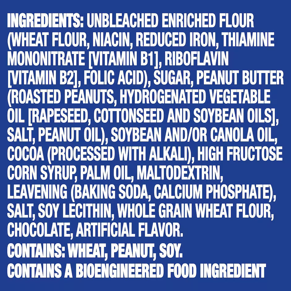 | Ingredients: | Milk Chocolate (Sugar, Cocoa Butter, Chocolate, Skim Milk, Milk Fat, Lactose, Lecithin [Soy], PGPR), Peanuts, Sugar, Vegetable Oil (Palm Oil, Shea Oil, Sunflower Oil, Palm Kernel Oil, Soybean Oil, Canola Oil, and/or Safflower Oil), Dextrose, Skim Milk, Corn Syrup Solids, Lactose (Milk). Contains 2% or less of: Salt, Tapioca Starch, White Rice Flour, Lecithin (Soy), Artificial Flavor, Baking Soda, Chocolate, Cocoa (Processed with Alkali), Cornstarch, Invert Sugar, Oat Flour, Xanthan Gum, PGPR, TBHQ and Citric Acid (to maintain freshness). |