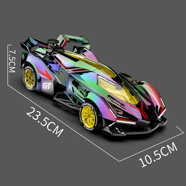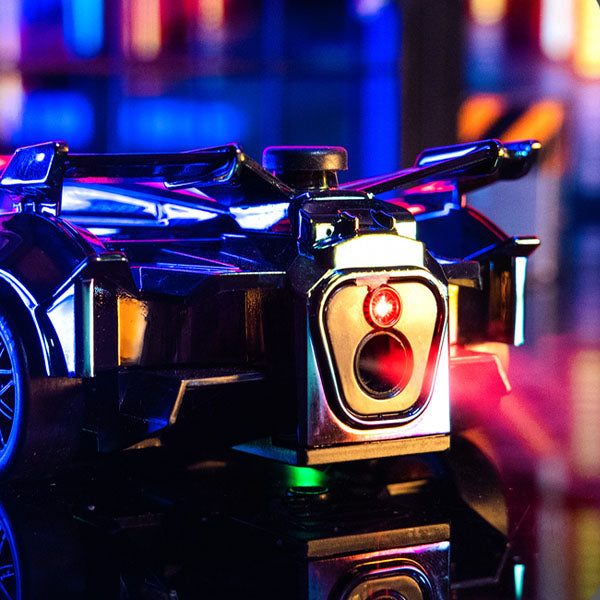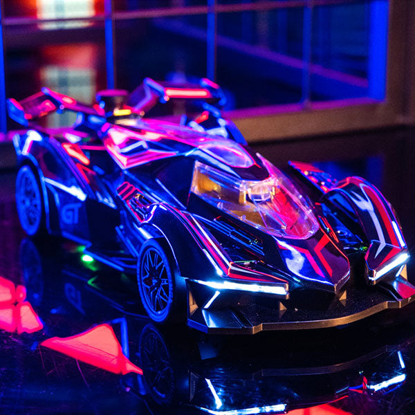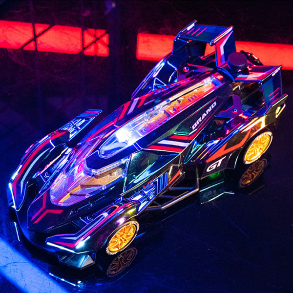 The DriftStorm Holo Racer features a color-shifting holographic body that changes appearance depending on the lighting and viewing angle. As the car speeds across the floor, its reflective surface catches the light, creating a dynamic rainbow effect that makes every race feel futuristic and electrifying.