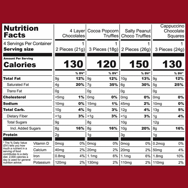 | 4 Layer Chocolate Ingredients | Sugar, Hazelnuts, Cocoa Butter, Cocoa Mass, Whole Milk Powder, Soy Lecithin, Natural Flavors. |